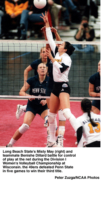 The 49ers closed the deficit to 8-5 before finally tying the game at 8, 9 and 10. Long Beach State took its first lead of the game at 11-10 on a kill by senior setter Misty May, the 1997 and 1998 AVCA Player of the Year.