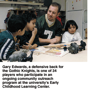 Why are the Gothic Knights so appreciative of what they have? Because they volunteer weekly in a community outreach program that enables them to interact with physically challenged students at the A. Harry Moore Laboratory School in Jersey City.