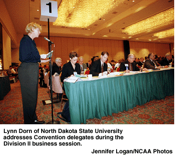 Delegates also heard reports from the Division II Presidents Council, the Division II Strategic Planning Project Team, the Division II Management Council, and the Budget and Finance Committee. After voting was completed, they also heard a presentation on the new distribution formula for the Division II Enhancement Fund, heard a report from the Division II Project Team to Review Issues Related to Diversity, and heard a report from the Division II Legislation Committee about the division's deregulation efforts.