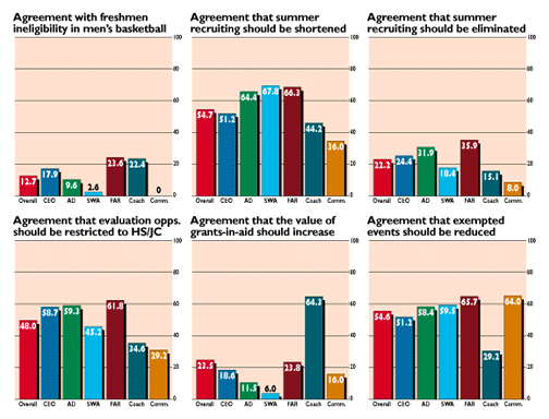 The Division I Working Group to Study Basketball Issues sought reaction from various groups on certain possible solutions to perceived trouble spots in Division I basketball. Those surveyed showed little overall support for making freshmen ineligible for competition and for eliminating summer recruiting. Most groups also did not agree with increasing the value of a grant-in-aid (although coaches did support such a change). There was agreement among most groups surveyed that summer recruiting should be shortened and that exempted events should be reduced. The NCAA research staff surveyed 907 individuals in Division I, including those listed in the tables above.