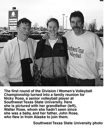 Championship reunites familyParticipating in NCAA championships offers young people many opportunities for new experiences, but for Nicky Rose, a senior setter on the women's volleyball team at Southwest Texas State University, it was a chance to meet a grandfather she hadn't seen since she was a baby.