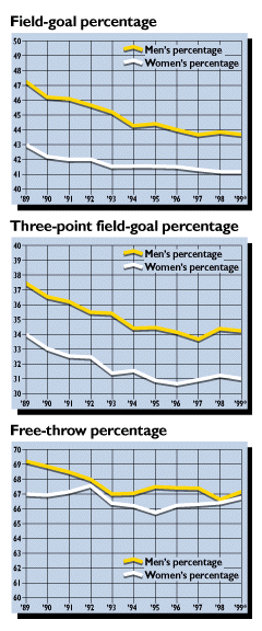 Division I basketball field-goal percentages for both men and women are low at the midpoint of the 1999 season, but at least they do not appear to be falling significantly from recent years. At the midpoint of the 1998-99 season, Division I men are shooting 43.7 percent from the field. The figure for last year was 43.9 percent. The figure has not deviated more than .7 percent since 1994. Three-point field-goal shooting for men, 34.2 percent, also is down slightly from last season's year-end figures. It is, however, a bit higher than the all-time low of 34.1 established in 1997. Although three-point shooting is well below the all-time high of 38.4 percent established in 1987, it has varied by only .4 percent since 1994. Men's free-throw shooting is flirting with a new low. The midseason percentage of 67.1 percent matches the modern low set in 1994. The story is somewhat the same in Division I women's basketball. Overall field-goal shooting stands at 41.5 percent, almost identical to last year's final figure of 41.6 percent. The all-time high is 44.2 percent (1986), and the record low is 41.2 percent (1997). The women currently are shooting 31.0 percent from three-point range, which is near the all-time low of 30.8 percent established in 1996. Free throws are being made at a rate of 66.8 percent, which is nearer the all-time high than the record low. The average number of points per team in a men's game this season is 70.5, which is notably lower than last year's 71.4 (it also was 71.4 at midseason last year).