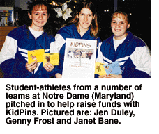 the College of Notre Dame," said Margaret Brack, director of campus ministry at the college. "This sense of responsibility to the greater community permeates the campus atmosphere. The student-athletes' enthusiasm and success with the KidPins is a prime example of the interest and commitment of CND students in aiding people in need."