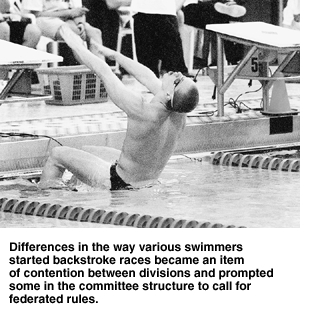 She said coaches in each division were at odds over where backstrokers could place their toes at the start of the race. Division III wanted to modify the rule that required a swimmer to place his or her feet flat on the starting wall with the toes under the line of the water. Because so many backstrokers, particularly at the Division III level, were slipping upon takeoff, coaches wanted to allow competitors to curl their toes over the rim of the gutter in order to stabilize the takeoff.