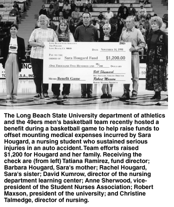 Hougard, who also worked at a local restaurant, had been sitting on a curb waiting for a ride to work when a car struck her, leaving her with numerous severe internal injuries, a broken back and a severed left leg. Hougard remains in serious condition at Western Medical Center in Santa Ana, and she will require a prosthetic leg. Individuals from the athletics department attended a benefit for Hougard held at the restaurant where she worked, and it was there that they discovered she was a Long Beach State student. That was enough to trigger efforts to help. "You can always say, 'Let somebody else help out,' " said Roy Englebrecht of the Long Beach State athletics department. "But this is a unique university. Sara is a part of our team." The athletics department teamed up with the Long Beach State department of nursing and hosted a benefit for Hougard at the Long Beach State men's basketball game against California State University, Northridge. Fifty percent of each ticket sold by the school of nursing was earmarked for Hougard, raising $1,200. "Our hearts certainly go out to Sara and the Hougard family at this time," said Bill Shumard, athletics director at Long Beach State. "This game will hopefully serve as a rallying point for Sara's many colleagues to provide a tangible means of support to the Hougard family during their time of need." Those who know Hougard expressed their gratitude to the athletics department for their willingness to make her a part of the team. "Sara Hougard is an exceptional young woman who brings to professional nursing (her) academic excellence, values, ethics and compassion," said Christine Talmadge, director of the Long Beach State department of nursing. "Faulty, staff and students of the nursing department thank our colleagues in athletics for this gesture of caring and compassion for one of our own." Hougard plans to return to nursing once her injuries have healed and she is fitted with a prosthetic leg. Those interested in helping Hougard may send checks to: Long Beach State Nursing, in care of the Sara Hougard Fund, 1250 Bellflower Boulevard, Long Beach, California 90840. Wilson chosen for footballThe NCAA has named Wilson Sporting Goods as the official supplier of the football for the Association's football championships. Wilson will be the official ball for NCAA football championships in Division I-AA, Division II and Division III. This agreement will be in effect from the 1999 to 2003 football seasons. s Wilson also will be the official ball of NCAA Football, an initiative made up of the American Football Coaches Association, the National Association of Collegiate Directors of Athletics, the Conference Commissioners Association and the NCAA. Wooden award on FoxThis year the John R. Wooden Award presentation will be televised via Fox Sports Net to a national audience. The award, given annually by the Los Angeles Athletic Club to the men's national college basketball player of the year, will be presented during a one-hour broadcast airing April 2 at 8 p.m. Central time. A highlight for the 1999 ceremony will be the "Legend of Coaching" lifetime achievement award presented to Dean Smith, former men's basketball coach at the University of North Carolina, Chapel Hill. For more information, see the award's Web site at www.woodenaward.com.