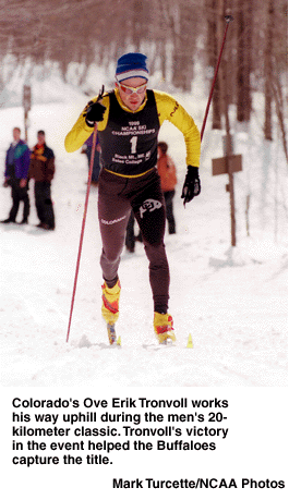 The Buffaloes also got a one-two finish in the men's 20-kilometer classical cross country race. Ove Erik Tronvoll took first with a time of 56.17.0, followed by Magnus Ericksson, whose time was 57:53.2. Tronvoll finished eighth in the same race last year.