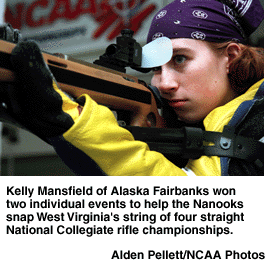 Led by Kelly Mansfield, Alaska Fairbanks shot a meet-record aggregate team score of 6,276 and snapped West Virginia's streak of four consecutive titles at the National Collegiate Men's and Women's Rifle Championships March 12-13 at Norwich.