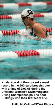 Georgia led by six points over Southern Methodist after the first day of competition without a first-place finish. Kristy Kowal defended her 100-yard breaststroke title to give the host its first individual champion. The junior was named swimmer of the meet after she won the 200-yard breaststroke in a meet-record 2:07.66.