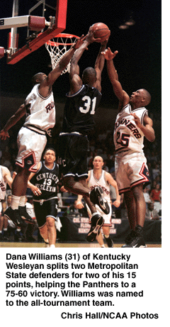 Kentucky Wesleyan's balanced attack also featured 15 points from Dana Williams and 10 each from Pat Critchelow and Will McDonald. Both Williams and Garcia were repeaters on the all-tournament team. Metro State's Lee Barlow, who led the Roadrunners with 19 points, also made the team, as did teammate DeMarcos Anzures, who had eight points in the title game. John Bynum added 15 for Metro State in the championship game.