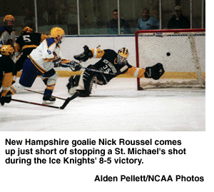 Shots on goal: New Hamp. Col. 8-19-12 -- 39; St. Michael's 8-9-10 -- 27. Saves: NH -- Nick Roussel 23; SM -- Nick Dion 35. Penalties: NH -- 9 for 18 min.; SM -- 11 for 30 min. Officials: Fred Campetelli and Bill Dorian (referees), Michael Cross (linesman). Attendance: 1,113.
