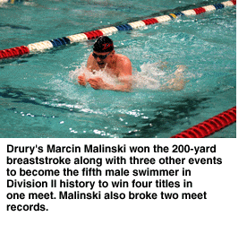 Marcin Malinski totaled four individual wins and broke two meet records for Drury, including a mark of 1:48.81 in the 200-yard individual medley.
