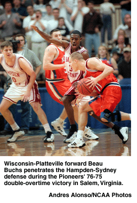 It took two overtimes before Wisconsin-Platteville could clinch its second consecutive Division III Men's Basketball Championship, 76-75, over Hampden-Sydney March 20. It was the first double-overtime game in Division III championship-game history and the second in men's basketball in any division. The other was in the 1957 Division I championship game, when North Carolina beat Kansas in three overtimes.