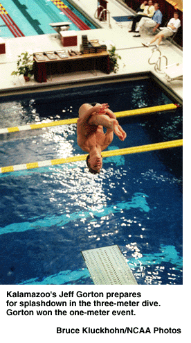 John Karpe from Wisconsin-Eau Claire earned diver of the year honors after claiming the three-meter diving championship with a score of 559. He also took second in the one-meter event. Kalamazoo's Jeff Gorton repeated as one-meter titlist.