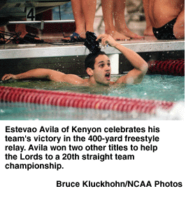 Tom Rushton and Estevao Avila fueled Kenyon's 20th straight Division III Men's Swimming and Diving Championships team title March 18-20 at Minnesota.