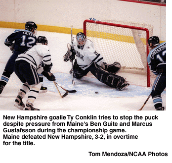 Maine clinched its second title when Cory Larose picked up a loose puck along the left boards and found Gustafsson in the slot. Gustafsson's initial shot was stopped by Wildcats goaltender Ty Conklin, but the senior forward secured the rebound and lifted the puck over a sprawling Conklin to spark a Black Bears' celebration.