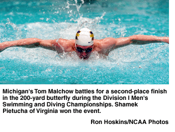 200-yard butterfly: Final -- 1. Shamek Pietucha, Virginia, 1:43.50; 2. Tom Malchow, Michigan, 1:43.58; 3. Stephen Parry, Florida St., 1:44.36; 4. Steven Brown, Stanford, 1:44.63; 5. Andrew Livingston, UNLV, 1:45.00; 6. Adam Messner, Stanford, 1:45.03; 7. Doak Finch, Virginia, 1:45.10; 8. Jeff Somensatto, Auburn, 1:46.12. Consolation -- 9. Yoav Meiri, Minnesota, 1:45.78; 10. Nate Dusing, Texas, 1:45.96; 11. Matt Hall, Tennessee, 1:45.97; 12. Devin Howard, Texas A&M, 1:46.32; 13. Bret Awbrey, Southern California, 1:47.09; 14. Ben Anderson, Arizona, 1:47.13; 15. Jan Vitazka, Cincinnati, 1:47.32; 16. Zane Dewitz, Tennessee, 1:48.80.