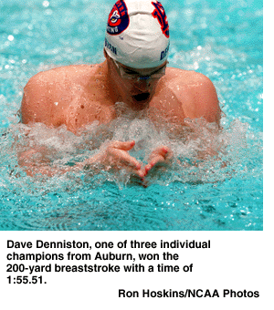 200-yard breastroke: Final -- 1. Dave Denniston, Auburn, 1:55.51; 2. Edward Moses, Virginia, 1:57.06; 3. Scott Werner, Michigan, 1:57.52; 4. Jeff Hopwood, Michigan, 1:58.02; 5. Nuk Sirisanont, California, 1:58.19; 6. Valery Kalmikous, Nebraska, 1:58.21; 7. Vilmos Kovacs, Purdue, 1:59.06; 8. Andrew Chan, California, 1:59.07. Consolation -- 9. Lionel Moreau, Auburn, 1:58.83; 10. Peter Aronsson, California, 1:59.11; 11. Dmitri Malinovski, Brigham Young, 1:59.50; 12. Dov Malnik, Minnesota, 1:59.85; 13. Ethan Hall, North Carolina, 2:00.79; 14. Joe Montague, Texas, 2:00.90; 15. Kevin Dupuis, Cincinnati, 2:00.99; 16. Ryan Zahorik, Wisconsin, 2:01.07.