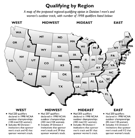 Boundaries for the four geographic regions have been proposed and researched by the ad hoc committee and exist as relatively vertical lines. The divisions also are based on qualifiers from the 1998 championships and the number of institutions within the regions that sponsor track and field.