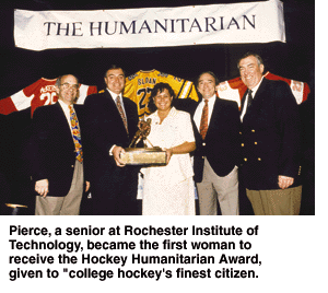 At the recent NCAA Division I Men's Ice Hockey Championship, Pierce was named the winner of the Humanitarian Award, the annual award given to "college hockey's finest citizen." The award salutes one person who is exemplary off the ice as well as on it, who displays strong personal character and a commitment to scholarship, and whose contributions to his or her larger community -- beyond the confines of the game and team -- are worthy of everyone's attention. Pierce also is the first woman to win the honor.