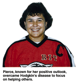 Pierce was a freshman when her life changed forever. She discovered a lump in her neck, a lump that turned out to be Hodgkin's disease. The disease forced her to undergo chemotherapy and radiation, and it forced her to miss her freshman hockey season at Rochester Institute of Technology.