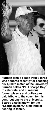 April 10 was Paul Scarpa Day at Furman University this year as Scarpa, the longtime men's tennis coach, was honored for his 1,000th match at the university. Scarpa is only the second Division I coach to oversee 1,000 matches at one school, joining Hawaii's Jim Schwitters in this exclusive club.