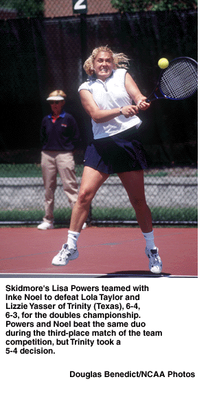 Skidmore's Inke Noel combined with Lisa Powers to capture the doubles championship. Noel and Powers beat Lizzie Yasser and Lola Taylor of Trinity (Texas), 6-4, 6-3. The individual title was the second for the Thoroughbreds, the first coming last year when Jamie Levine won the singles championship.