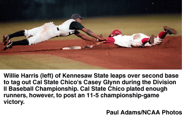 After waiting through a 2 1/2-hour rain delay, Cal State Chico flooded Kennesaw State with eight runs over two innings to win its second Division II Baseball Championship May 29 in Montgomery, Alabama.