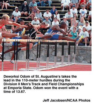 St. Augustine's Deworski Odom and Gabriel Burnett combined for 37 of their team's points. Odom won the 110-meter high hurdles and was the runner-up in the 100-meter dash. Burnett was second to Odom in the 110 hurdles, sixth in the 100-meter dash and second in the 200-meter dash.