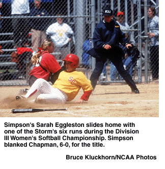 Simpson's Kelly Hall helped the Storm take an early lead by singling for her first RBI of the tournament in the opening inning. After stranding five runners in the first three innings, the Storm broke the game open in the fifth, scoring two runs off of a Chapman error. Schade kept the Panthers scoreless, retiring the final 12 batters she faced.