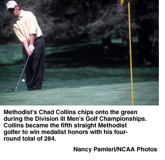 1. Chad Collins, Methodist, 72-66-70-76 -- 284; 2. Devin Redmond, Williams, 72-74-74-74 -- 294; 3. Damon Aswad, Methodist, 74-78-70-74 -- 296; 4. Ian Miller, Ohio Wesleyan, 75-76-74-76 -- 301; 5. (tie) Nathan Smith, Allegheny, 77-71-77-77 -- 302; and Steve Erickson, Gust. Adolphus, 77-70-78-77 -- 302; 7. Josh Dirks, Wis.-Eau Claire, 75-77-73-78 -- 303; 8. (tie) Bob Wellman, Neb. Wesleyan, 76-73-78-77 -- 304; Eric Bleile, Greensboro, 78-75-74-77 -- 304; Greg Johnson, UC San Diego, 74-81-71-78 -- 304; Pete Stefanchik, Methodist, 78-73-74-79 -- 304; and Tony McCutcheon, Williams, 73-74-77-80 -- 304.