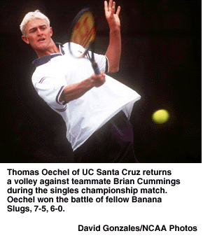 Thomas Oechel won the singles championship by defeating teammate Brian Cummings, 7-5, 6-0. At the 1998 championships, Cummings lost in the second round of the singles competition and Oechel was ousted during the quarterfinals.