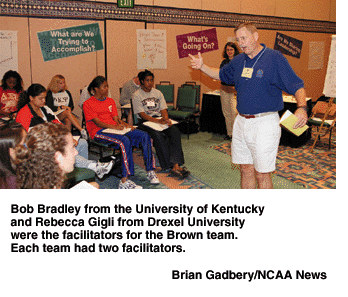 The Brown team's facilitators, Rebecca Gigli, assistant athletics director for academic services at Drexel University, and Bob Bradley, associate athletics director at the University of Kentucky, pointed out that Jackson's comments about sports and leadership were particularly relevant.