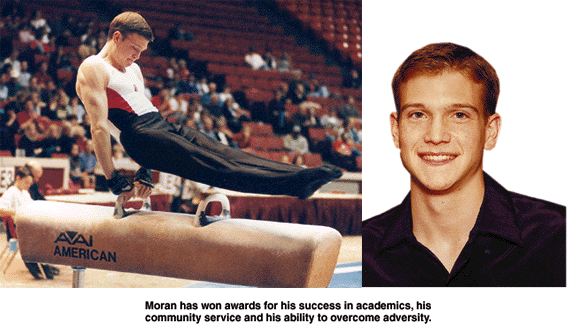 Sports helped Moran manage his disease, and he discovered that he had a gift for gymnastics. Moran was a three-time all-American gymnast in high school, and he won the Texas high-school state championship on the pommel horse.