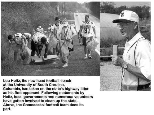 Holtz, the longtime football legend at the University of Notre Dame and now the new head football coach at the University of South Carolina, Columbia, has created a lot of interest lately in the litter along the state's highways.