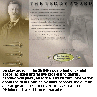 Some of the pageantry will include banners that will hang from the 50-foot ceiling of the Great Hall celebrating current NCAA champions. Two levels of exhibits will feature highly interactive displays and state-of-the-art technology. There will be trivia games to play, multimedia video presentations to see, computer games to challenge and hands-on displays to touch.