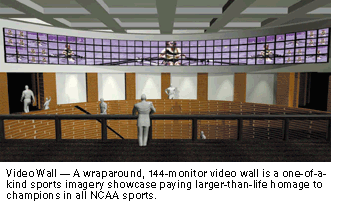 Some of the "wows" include a wrap-around, 144-monitor video wall directly above the entrance atrium. Hiller called the wall a one-of-a-kind sports imagery showcase paying larger-than-life homage to champions in all NCAA sports. In addition, four theaters will offer a mix of video presentations, including a "locker room" theater and a "classroom" theater that will offer insights into the world of college athletics by celebrated coaches and student-athletes.