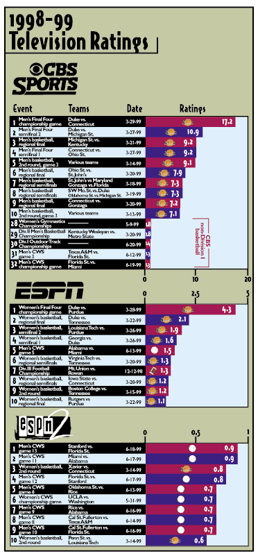 Television ratingsTelecasts from the NCAA Division I Men's Basketball Championship were the most-watched NCAA programming on CBS during the 1998-99 academic year while the Division I Women's Basketball Championship and the Division I Baseball Championship were the most popular attractions on ESPN and ESPN2. The March 29 men's basketball championship game between the University of Connecticut and Duke University drew a rating of 17.2. Games from the men's basketball championship were the 27 highest-rated NCAA programs on CBS. The highest-rated non-basketball programs were the National Collegiate Women's Gymnastics Championships and the Division II Men's Basketball Championship. The Division I Women's Basketball Championship title game between Purdue University and Duke was the top-rated NCAA telecast on ESPN at 4.3.