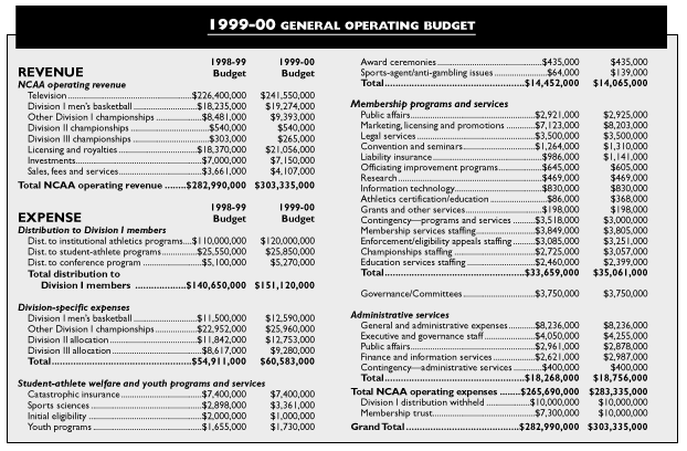 The NCAA Executive Committee recently approved an operating budget of $303.3 million for fiscal year 1999-00, which represents an increase in revenue of 7.2 percent ($20.3 million), achieved primarily from scheduled increases in television rights fees.