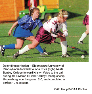 Host Bloomsburg capped an unbeaten season with its fourth straight NCAA Division II Field Hockey Championship November 7, downing Bentley, 2-0.