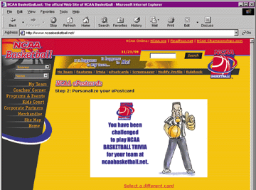 And, computer users may choose one men's or women's team from any of the three NCAA divisions. Fans may follow multiple teams -- or perhaps the men's and women's teams of the same university -- by changing their team preferences. Information on teams comes from two different sources. First, the site has services that search for scores and news. Next, the site takes scores and news from material sent by NCAA member institutions, thus giving many institutions their first international platform for such material about their basketball teams. In its first week, www.ncaabasketball.net featured 71 percent of all basketball scores -- men's and women's -- in all three divisions. That number, which will probably go higher as more schools decide to participate, makes the site the most comprehensive place on the Internet to locate basketball scores and team news. (If an institution is not yet participating in this free service and would like more information, a representative may contact Mary Eiland, NCAA assistant director of promotions, at meiland@ncaa.org.) Another interactive component of the site lets visitors test their college basketball knowledge in an ever-changing "Trivia Game," complete with scoreboards that show the site's daily and lifetime high scores. Visitors also will be able to participate in weekly polls contributing their views on a spotlighted subject pertaining to college basketball, as well as send electronic postcards, download screen savers and easily find links to athletics departments' home pages. Visitors can go to the "Coaches Corner" to watch videos featuring past and present coaches, they can download NCAA Basketball public service announcement videos or purchase NCAA Basketball merchandise, and they can also see more information about other NCAA Basketball-related events and programs. In January, the "Kid's Court" will make its debut with a variety of interactive games and information created just for kids. The site was created by Expidant, an Indianapolis-based technology company. Promoting the game In addition to being able to submit material for the new Web site, institutions can make the most of an NCAA Basketball Promotional Kit, which includes free materials the institution can use to promote its basketball teams and NCAA Basketball on campus. All NCAA member institutions were sent the kit, which includes information about the NCAA Basketball promotion, logos, public service announcements for radio and television, and information on acquiring free NCAA Basketball decals and signage that can be personalized for each institution. The NCAA also is continuing the "Take a Kid to the Game" promotion in conjunction with the NCAA Basketball campaign. Now entering its fifth year for women's teams, the program was expanded last year to include men's teams as well. (The program also is concluding its second year of affiliation with NCAA Football.) The program allows institutions to receive in-arena signage, promotional posters, copies of public service announcements and sample press releases. Most institutions select a specific game day to permit adults buying a full-price ticket to receive a youth ticket free or at a reduced rate, thus encouraging youth attendance. The "Take a Kid to the Game" promotion is a coordinated effort of the WBCA, the NABC, participating NCAA schools and Host Communications. For more information on "Take a Kid to the Game," call Emily Stevens at Host Communications at 972/778-7750. The final piece of this year's NCAA Basketball campaign is a promotional character that will be unveiled later in the season. Designed primarily to appeal to children, it will aim to engage and educate youth on the healthy physical and emotional value of basketball while also promoting youth basketball participation. The character, which will equally represent both men's and women's basketball, also will promote sportsmanship.
