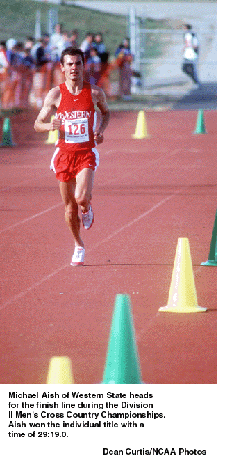 Western State's impressive performance was accomplished almost completely by underclassmen. Sophomore Michael Aish became the institution's first individual champion, covering the 10,000-meter course in 29 minutes, 19.0 seconds. Aish placed eighth in 1998 when the Mountaineers took second place.