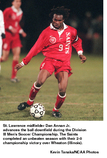St. Lawrence defeated host Wheaton (Illinois), 2-0, to win the Division III Men's Soccer Championship November 28. The Saints took home their third NCAA championship in all sports and their first in men's soccer.