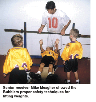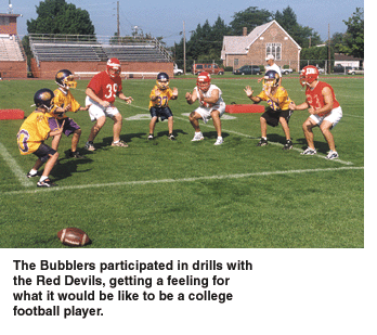 The Red Devils take the Bubblers through a slowed-down version of a Dickinson practice, complete with drills and stretching sessions. The youngsters are given the opportunity to actually work out alongside the team and see how a real college practice is run. They also get to ask questions, both of the coaches and of the players.