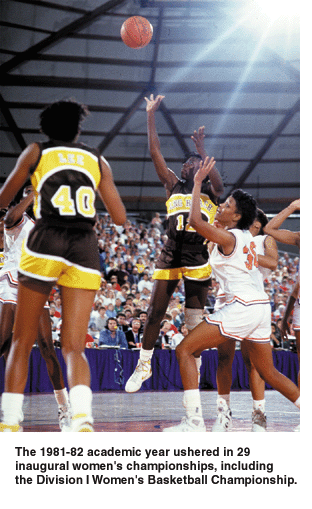 All that changed in the 1980s, when women's sports became a part of the Association. With the passage of Title IX in 1972 and the addition of women's championships to the NCAA in 1981 and 1982, women were at the forefront of a decade of change.
