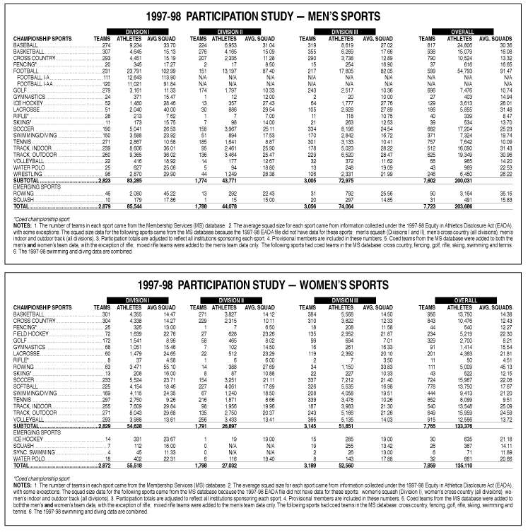 Women's sports participation showed a continued increase, rising 3.3 percent with 135,110 participants in 1997-98. There were a total of 203,696 men participating in sports in 1997-98, up .24 percent.