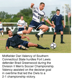 During the second overtime period, Southern Connecticut State's Dan Valency played a rebound from Tony Fernandes missed shot and maneuvered around a Fort Lewis defender to send the ball toward the net and teammate T.J. Delucia. An awkward side-footed kick was all the control Delucia needed to get the ball over the goal line and give the title to the Owls.