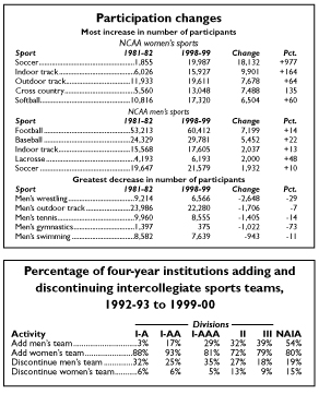The GAO study, released March 8, shows that the number of women participating in intercollegiate athletics at four-year colleges and universities increased from 90,100 to 162,783 between the 1981 and 1998 academic years. At the same time, men's participation increased from 220,178 to 231,866. The figures include institutions from the NCAA and the National Association of Intercollegiate Athletics.