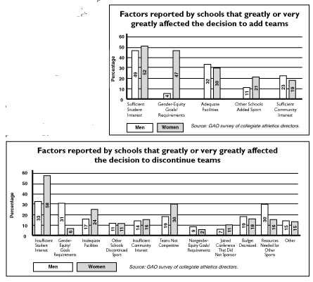 Although many programs cite the cost of meeting Title IX requirements as the cause for cutting men's programs, the study notes that most institutions added women's teams without discontinuing any teams. Those institutions that did cut men's programs most often cited declining interest as the reason. Decisions to eliminate teams tended to be made quickly, with three months or less typically transpiring between originating the proposal and making the final decision.