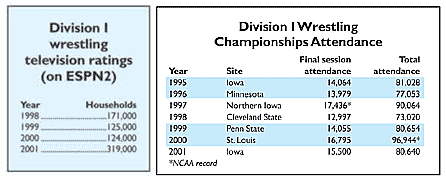 At the collegiate level, the wrestling renaissance has been led by the Division I tournament. The event is one of a handful of the Association's 87 championships where the financial bottom line is in the black. Last season, the championships were aired on ESPN2 a few hours after the final match was decided, a first for the event.
