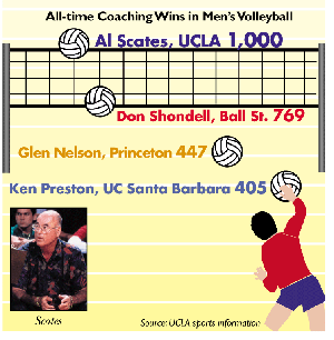 With a victory by the University of California, Los Angeles, men's volleyball team over Pepperdine University February 3, head coach Al Scates registered his 1,000th career victory, more than 230 wins more than his nearest competitor. In his 39th season as a head coach, Scates has a career record of 1,000-161.